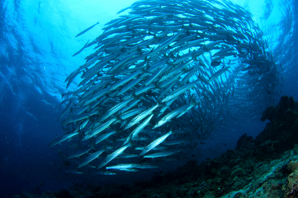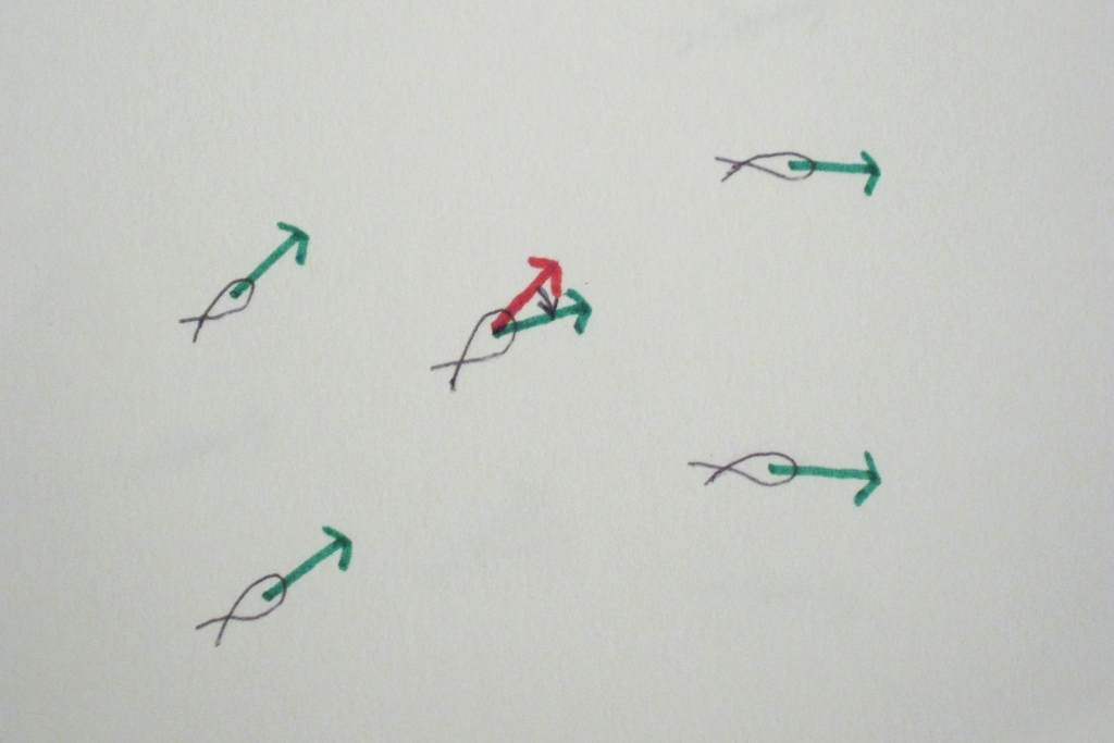 As a shoal of fish moves it can seem to respond to its environment as a single entity, particularly when a predator approaches. This behaviour puzzled biologists for some time, but behavioural biologist Iain Couzin among others recently began to unlock some of the mechanics behind their movement. A model of it can be made by setting out the movement of individual members – no overarching mechanisms across the shoal are needed. Members of the shoal will roughly move as follows:
