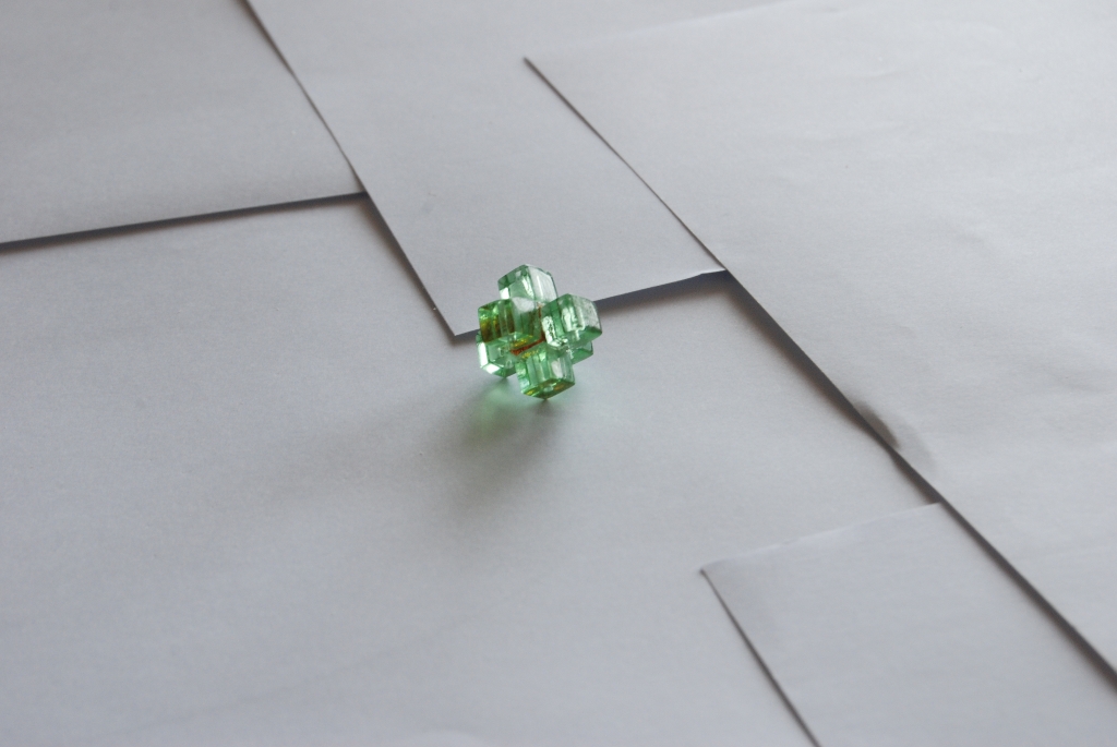 This was part of a collaborative project with artist Fiona Gannon and architect Sorcha Murphy. We were looking at how mathematical ideas may be used in finding forms and began exploring cellular automata, which are visual rules that determine the next step in building a structure based on its state. The structure may initially be very simple but as a rule is repeatedly applied it can grow in complexity. A good example of this is cellular automata rule 30. The fact that they’re visual and their behaviour may be unpredictable made them a good place to start. Physicist Stephen Wolfram’s book A New Kind of Science has many examples of cellular automata but as we looked through the book it became apparent that many algorithms covered in it would need to be implemented in software. Would it be possible to find interesting rules that could be made by hand? The snowflake algorithm in the book uses a hexagon as the basic building block, but a cube is similar in that it has six faces. We adapted the rule to work with cubes and went from there.