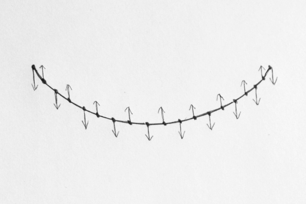 This process also works the other way – the strand being shaped into a curve will also change those strands that deform it. This leads to a good deal of complexity and it can be difficult to foresee how a particular arrangement will turn out. I started with something fairly simple – two right-angled lines and a point.