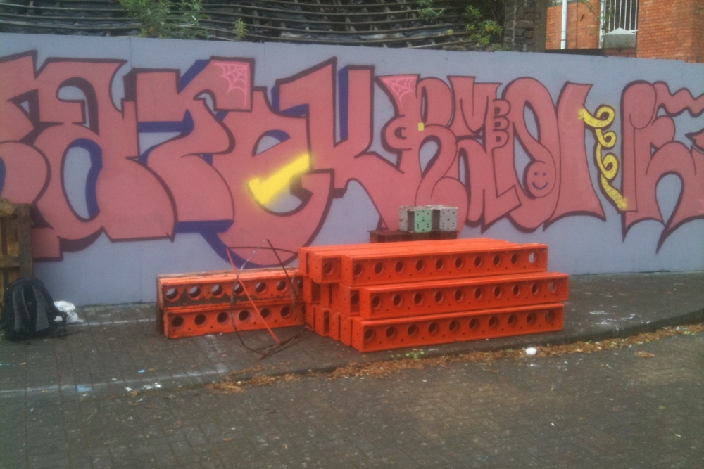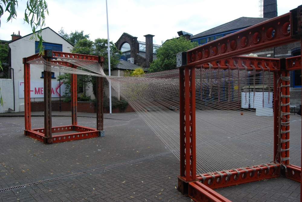 The work was being installed outdoors at my graduation show at NCAD, so it had to be robust enough to handle a mixture of crowds and alcohol! As the evening wore on the level of ‘interaction’ with it would likely increase. Heavy duty scaffolding looked like good option for the rigid part of the installation, with each beam weighing from 40kg to 60kg.