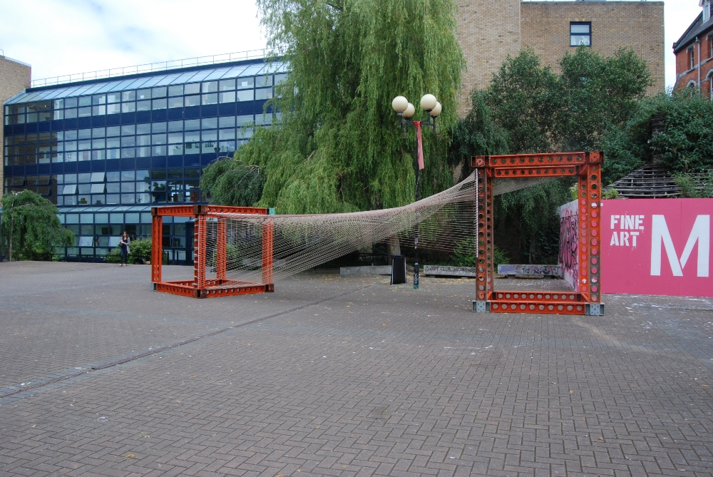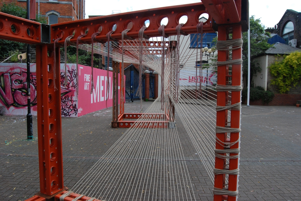 Following on from work in the Art Tunnel, I began to explore weaving between fixed structures as a means to develop form. An interesting, and initially unintentional, aspect of the buttress installation was the slight curve made by the woven surface. How would it be possible to take this further?